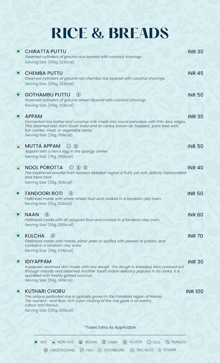 The menu also includes thoughtfully crafted starters, hearty soups, and a selection of breads like Appam and Puttu, perfect for sharing during family gatherings or casual meals. Traditional desserts like Ada Pradaman and Gothambu Payasam offer a gentle, comforting finish to the meal.